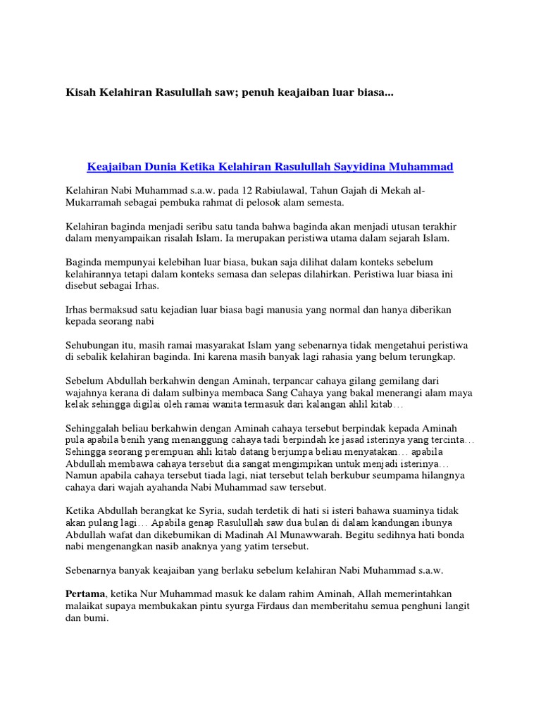 Sebelum semasa dan selepas kelahiran nabi muhammad saw kelahiran nabi muhammad s a w. Ibu baginda iaitu aminah binti wahab adalah anak perempuan kepada wahab bin abdul manaf dari keluarga zahrah ayahnya abdullah ialah anak kepada abdul muthalib. Peristiwa ajaib yang berlaku ke atas nabi muhammad s a w disebut sebagai irhas. Kelahiran nabi muhammad s a w pada tarikh 12 rabiulawal hari isnin bersamaan tahun 20 april 571 masihi tahun gajah di makkatul mukarramah semasa 4 tahun pemerintahan raja kisra anu syirwan raja parsi.