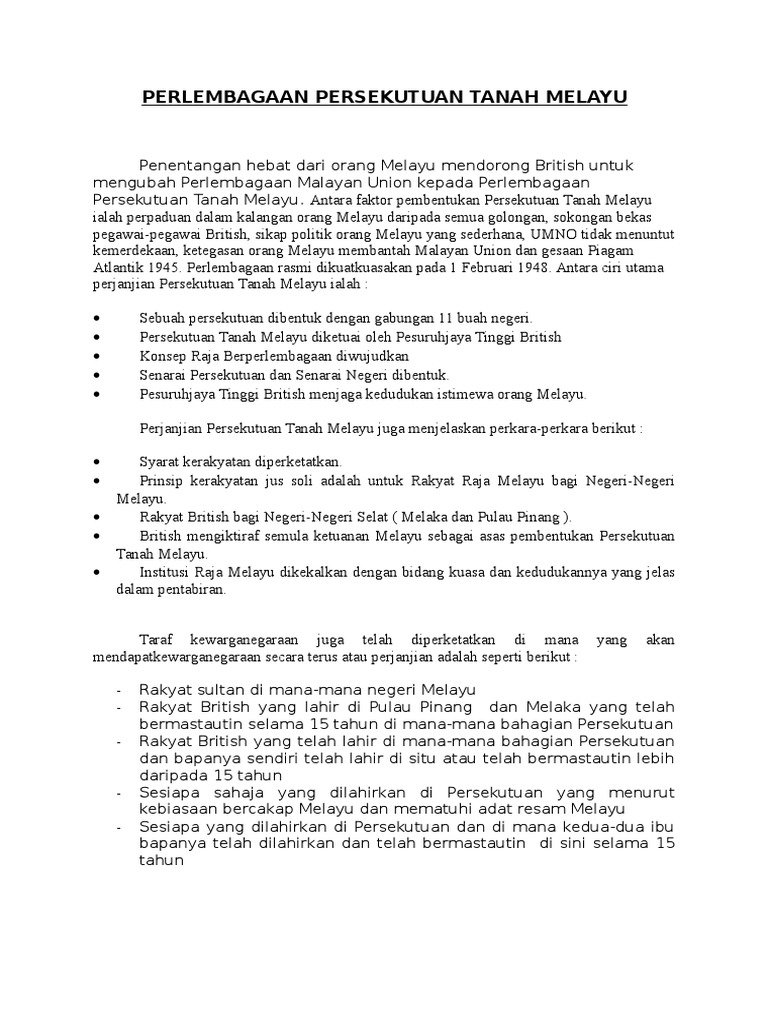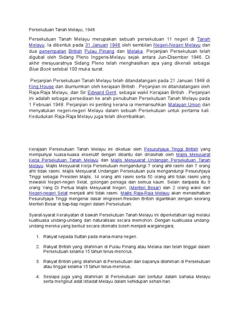 Terangkan faktor british mengambil tindakan di atas. Perjanjian ini adalah sebagai persediaan ke arah penubuhan persekutuan tanah melayu pada 1 februari 1948. Dewan perundangan persekutuan tanah melayu mengadakan persidangan pertama di dewan tuanku abdul rahman kuala lumpur pada 1948. Majlis mesyuarat undangan persekutuan tanah melayu.