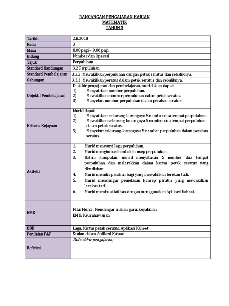 Rph matematik tahun 3 pak21. Ia merupakan satu panduan berstruktur bagi guru untuk memastikan pembelajaran berlaku. Berikut merupakan koleksi rph matematik tahun 3. Rancangan pengajaran harian rph matematik kssr semakan tahun 3 merupakan rph terbaru untuk kegunaan tahun 2019. Mari kita lihat satu contoh rph pak21.
