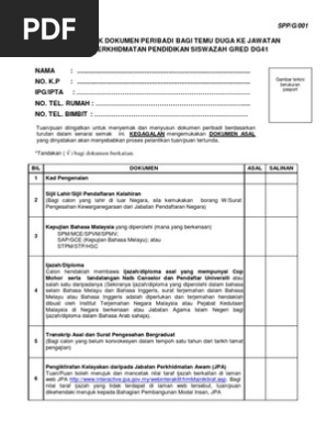 Senarai semak temuduga spp dg41. Senarai tugas dan ko kurikulum spp g 003 muat turun. Masukkan jawatan pegawai perkhidmatan pendidikan gred dg41 di dalam kotak tersebut. Klik pautan pengakuan pemohon dan pastikan semua maklumat yang telah diisi adalah betul. Kad pengenalan anda contoh.