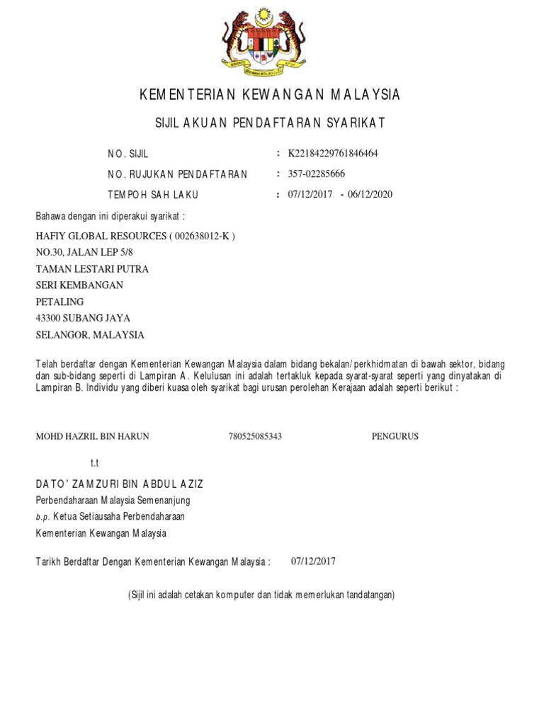 Kementerian kewangan malaysia sijil akuan pendaftaran syarikat k65832746272245275 357 02200237 17 04 2019 16 04 2022 no. Rujukan pendaftaran tempoh sah laku bahawa dengan ini diperakui syarikat. Syarikat anda perlu memiliki sijil pendaftaran kementerian kewangan sekiranya ingin berurusniaga dengan kerajaan seperti menyertai sebutharga atau tender bagi setiap pembekalan dan perkhidmatan yang anda tawarkan. 357 20015651 akuan pendaftaran kontraktor bumiputera no rujukan.