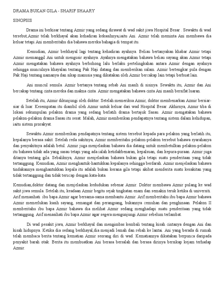 Semasa di dalam wad fikirannya bercelaru dan dengan membayangkan kehadiran ani bapa dan pak haji serta berdialog dengan mereka. Drama bukan gila kajian komsas antologi sejarah rindu tingkatan lima sinopsis. Komponen sastera dan novel bm bahasa melayu. Watak perwatakan plot dan nilai pengajaran.