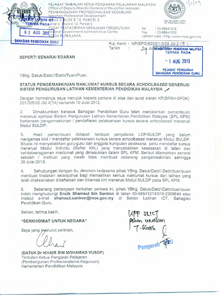 Ldp ppb yang didaftarkan menerusi modul ini perlu disemak dan disahkan diperingkat suldp bagi membolehkan ianya dikira sebagai bilangan hadir berkursus bagi tahun semasa. Kementerian pendidikan malaysia blok e8 kompleks e pusat pentadbiran kerajaan persekutuan 62604 w p. Ldp ppb yang didaftarkan menerusi modul ini perlu disemak dan disahkan diperingkat suldp bagi membolehkan ianya dikira sebagai bilangan hadir berkursus bagi tahun semasa. Selaras dengan pekeliling perkhidmatan kpm bil.