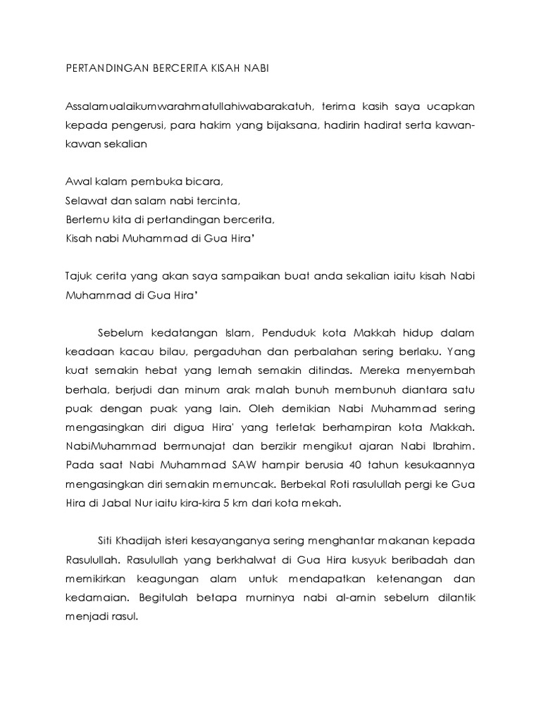 Anda di halaman 1 dari 5. Murid murid khususnya di peringkat sekolah rendah sangat seronok dan gembira apabila dapat masuk pertandingan bercerita biarpun belum ada kemahiran namun semangat dan keterujaan mereka haruslah dihargai. Teks bercerita mtq nabi muhammad wahyu pertama nabi muhammad saw bismillahirrahmanirrahim. Peristiwa nabi isa diangkat ke langit iii.
