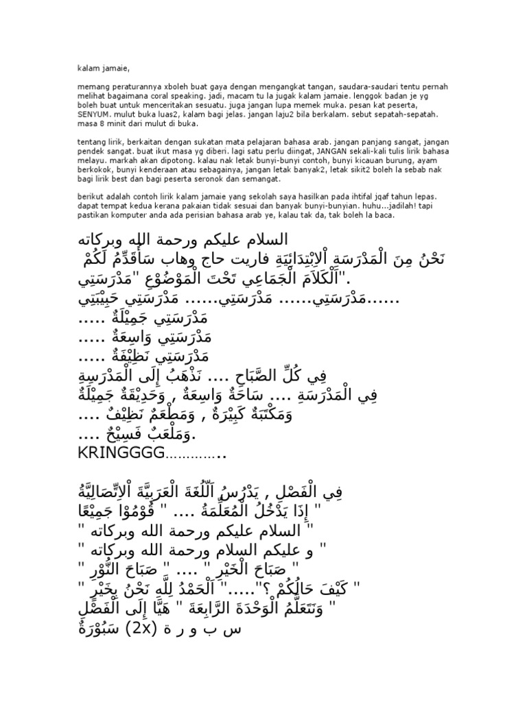 Teks kalam jamaie bahasa arab. Fil fasli di dalam bilik darjah. Kamus bahasa arab indonesia online belajar bahasa inggris online belajar bahasa arab asas belajar bahasa arab komunikasi. Makalah bahasa arab. Bengkel penulisan teks kalam jamai e sr 28 mac 2015 seramai 149 orang guru bahasa arab sekolah rendah telah didedahkan dengan tatacara menulis teks dan syarat syarat pertandingan kalam jamai e sepertimana yang telah digariskan oleh kementerian pendidikan malaysia.