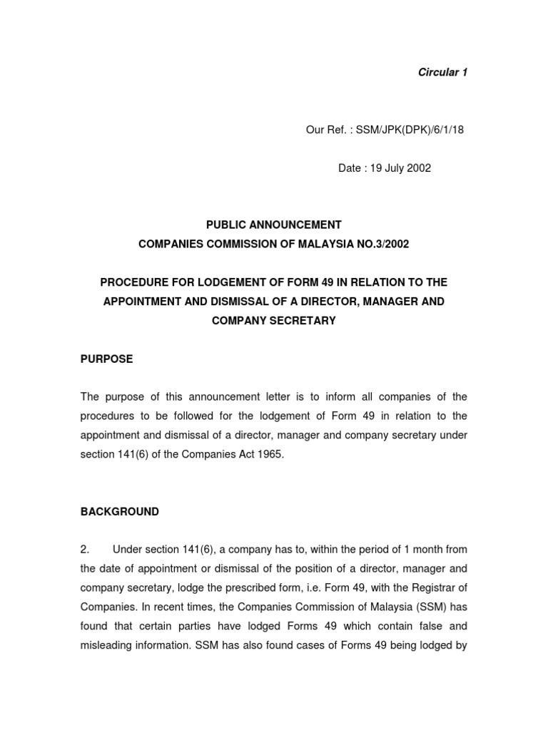 Board of directors must approve by sigining the board resolution to appoint new director. Previously for example anyone who wished to incorporate a company in malaysia would be required to submit form 6 form 48a and the m a as per the outlines of the companies act 1965. Changes of particulars are also made in form 49. You can download their company profile from ssm with a fee quote rayng18 nov 6 2013 09 16 pm.